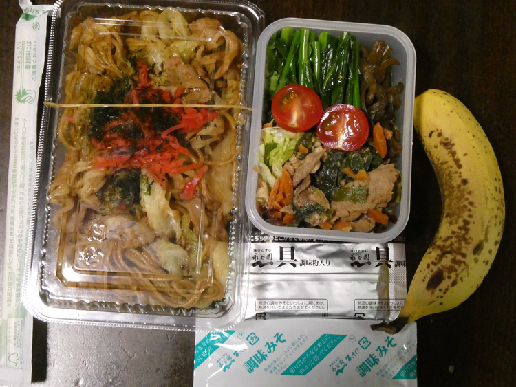 今日は、焼きそば、かき菜、手作りのキャラブキ、ミニトマト、豚肉の味噌炒め、バナナ、インスタント味噌汁です(^m^)/