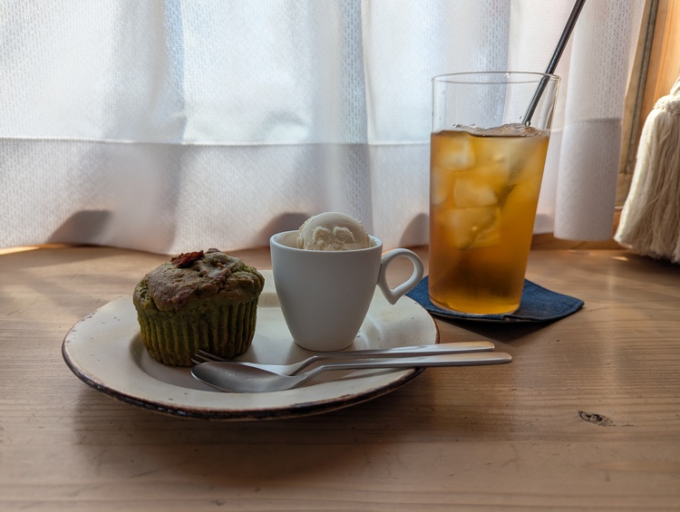 週末に出かけたカフェで、ビーガンマフィンとアイスティー。この和紅茶がスッキリ飲みやすくて美味しかったです。