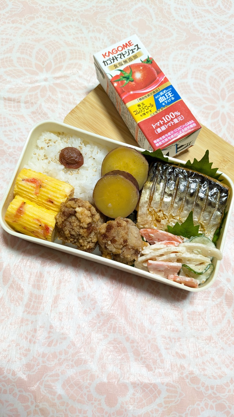 夫のお弁当 鯖塩焼き、さつまいも煮物、小海老入りだし巻き玉子、鶏から、蓮根サラダ、パック野菜ジュース。