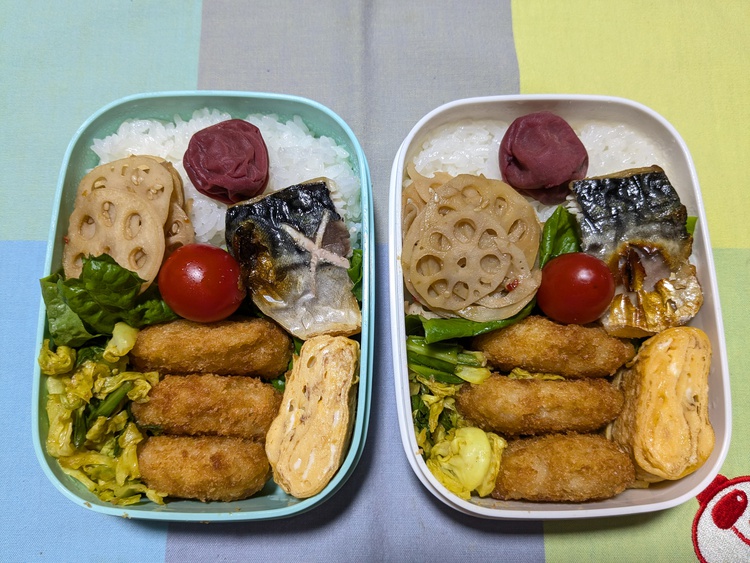 冷凍カツ、だし巻き玉子、キャベツのカレーソテー、レンコンのきんぴら、焼き鯖。