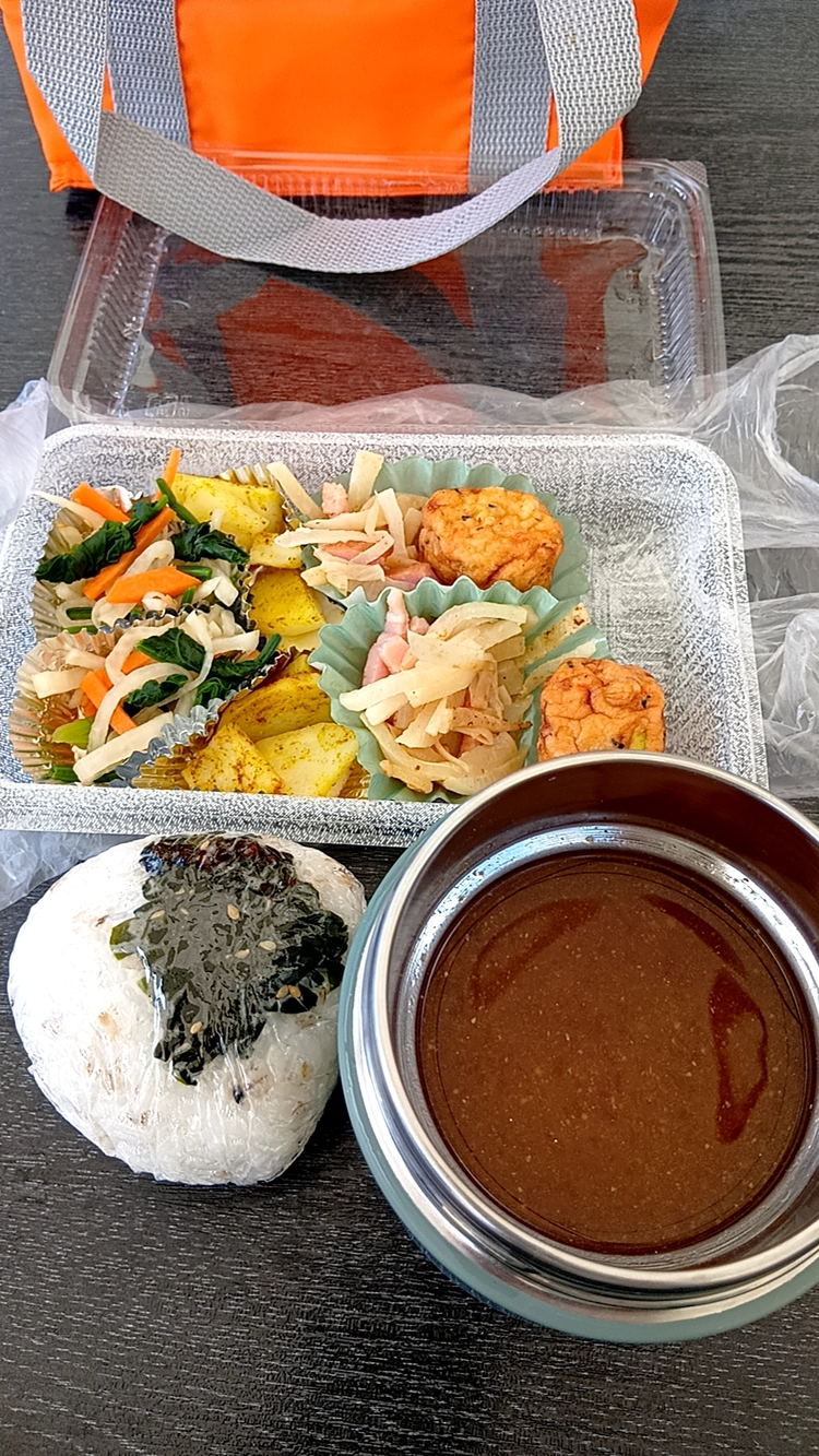 おにぎり、ふんわり揚げ、大根ナムル、大根マヨ炒め、じゃが芋カレーバター、なめこ味噌汁