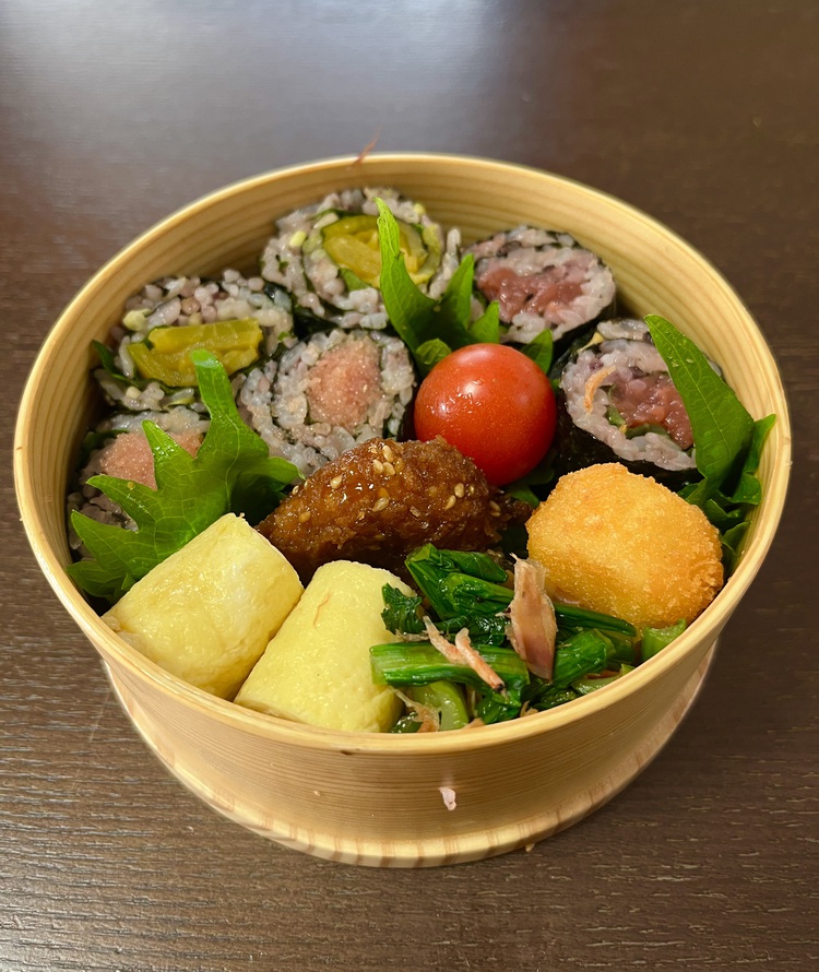 巻くだけおにぎらず、彩りよく、雑穀米で健康的(ʘᴗʘ✿)だし巻き玉子もふっくらいて、美味しそう(≧▽≦)