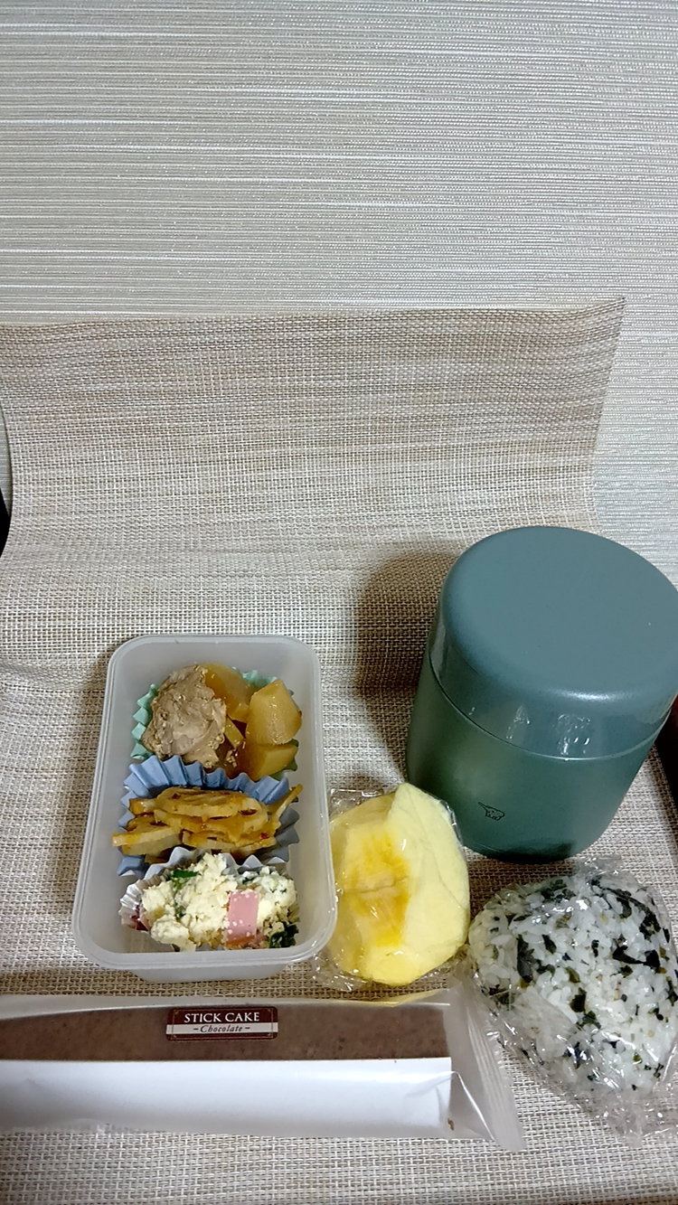 わかめおにぎり、大根と鶏肉味噌煮、おからサラダ、れんこんのレンチン味噌炒め、味噌汁、りんご、おかし