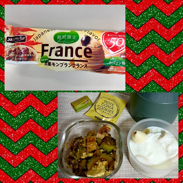 菓子パン、ゴーヤチャンプルー、味噌汁、バナナヨーグルト🍌、お菓子