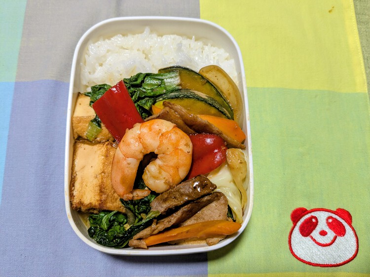 昨夜の焼き肉の残り材料をまんま炒めて焼肉のタレで味付けして詰めただけ^^;