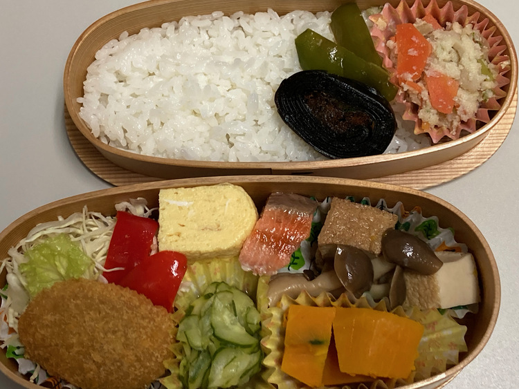 今日のお弁当です。ご飯の上には昆布巻きとピーマンが乗せてありました。おから、きゅうり酢の物、かぼちゃや厚揚げの煮物など、野菜中心のおかずです。だし巻き卵もあって、盛りだくさんのお弁当、あっという間になくなりました。ちょっと寂しいですが、午後もがんばります。