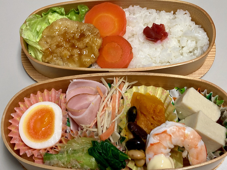 昨日のお弁当です。かぼちゃとお豆の煮物、高野豆腐、ごぼうサラダにゆで卵、レンコンハサミ揚げに大きなぷりぷりエビが入ってました。レンコンハサミ揚げは味の素さんのお力を借りました。美味しく頂き、午後もガンバでした。